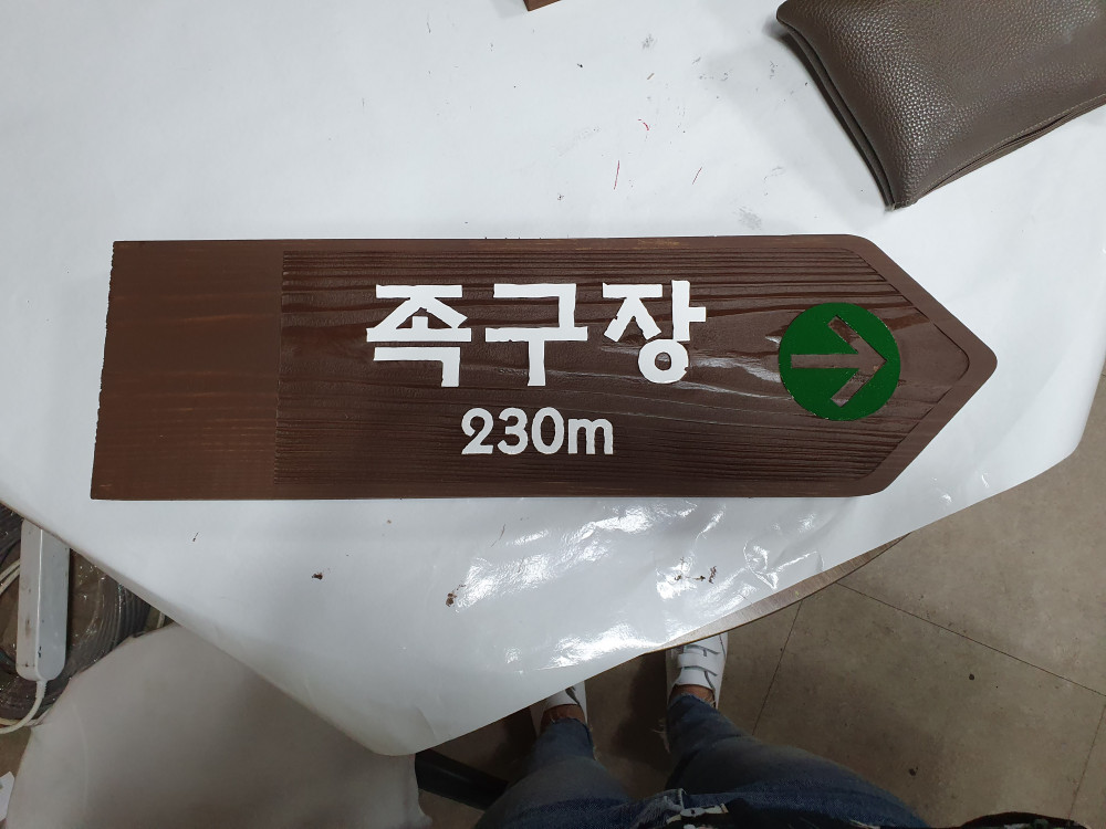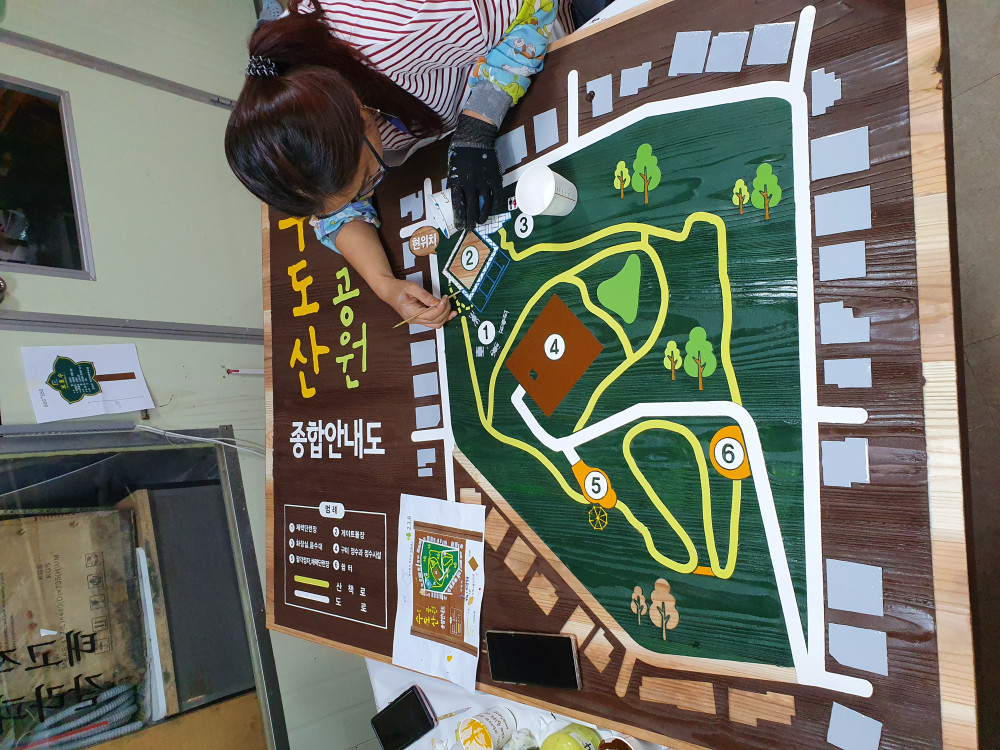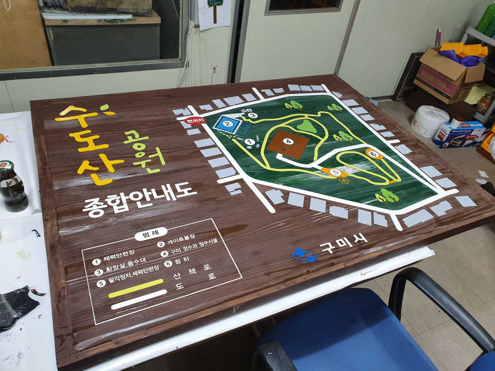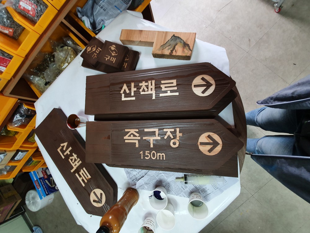 구미 수도산 공원 나무간판과 나무이정표 제작 작업 사진입니다.