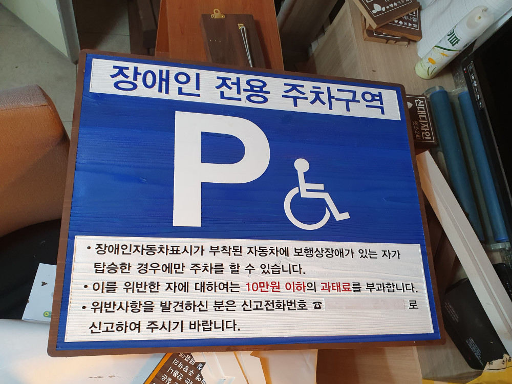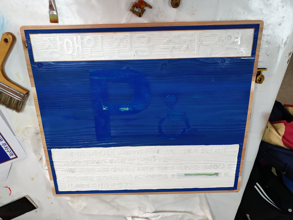 함안 장애인 전용 주차구역 안내판 제작 작업 사진입니다.