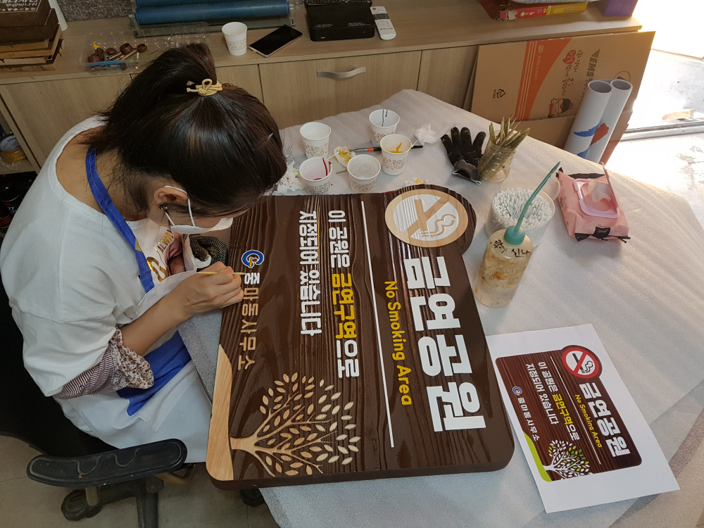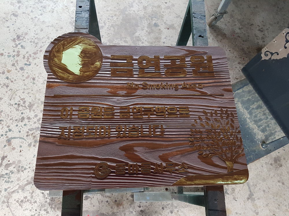 중마동사무소 금연공원 나무간판 작업 사진입니다.