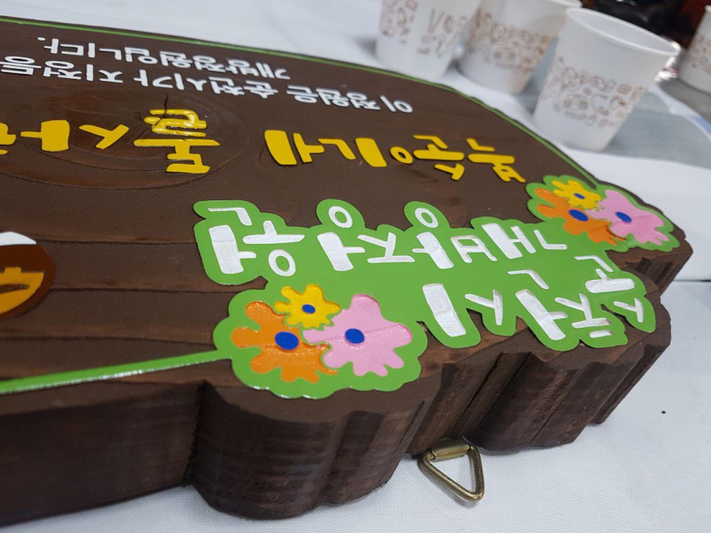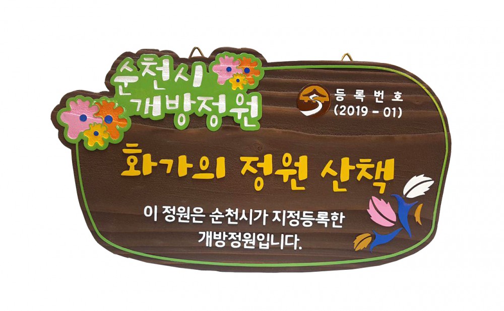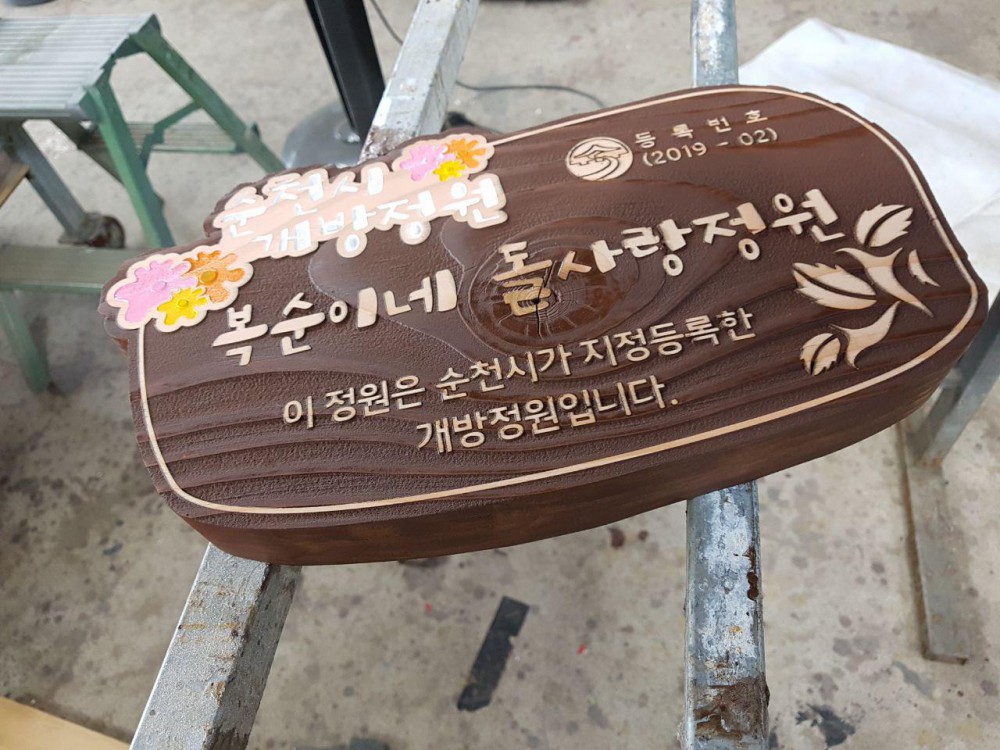 꽃과 '순천시 개방정원'글자 부분은 음각으로 넣었으며 뒤쪽에 고리를 달았습니다.