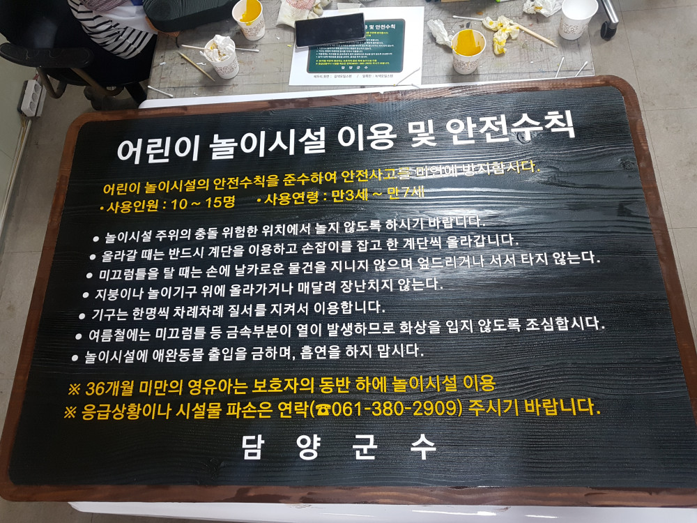 담양군 어린이 놀이시설 나무안내판 작업 사진입니다.